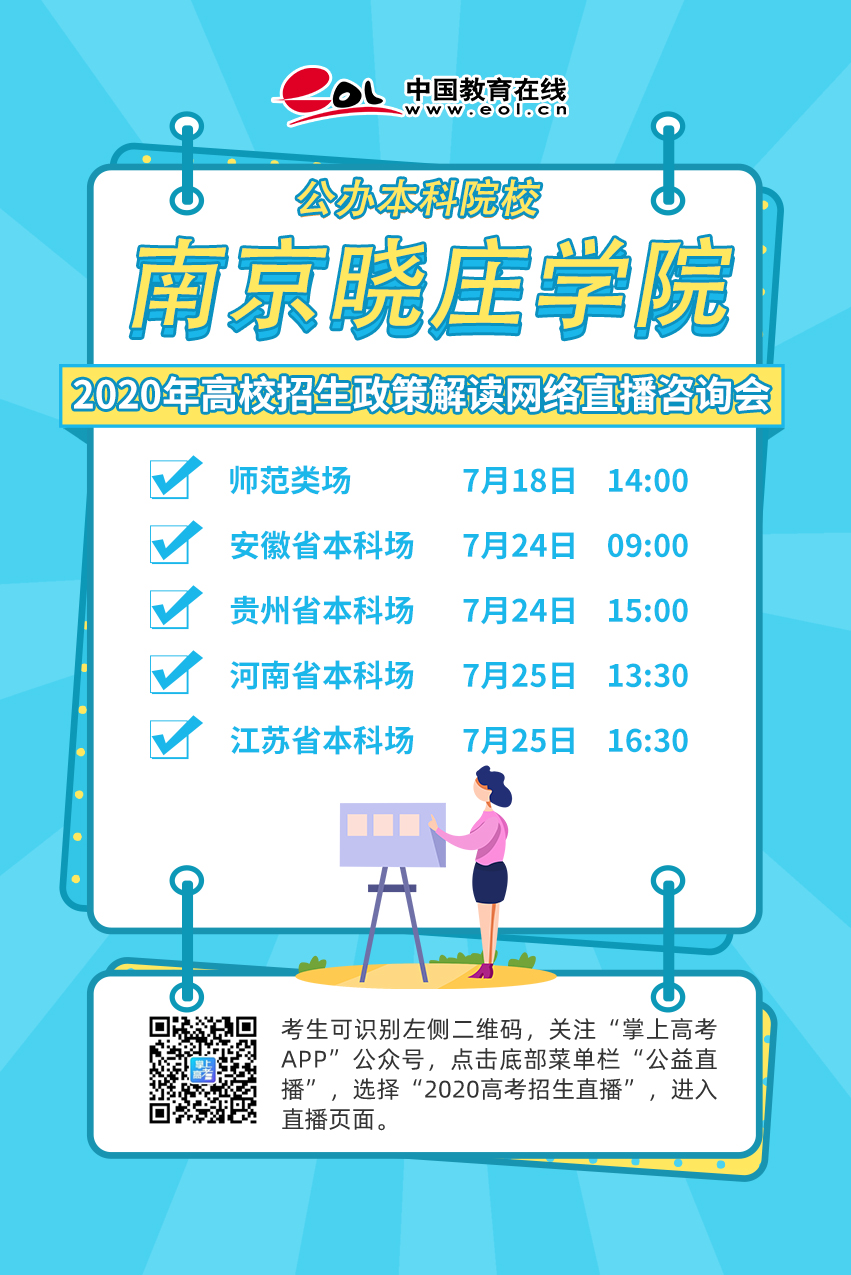 直播网址:可扫描图片中二维码,关注“掌上高考 APP ”公众号,点击底部菜单栏“公益直播”,选择“2020高考招生直播”进入直播页面。